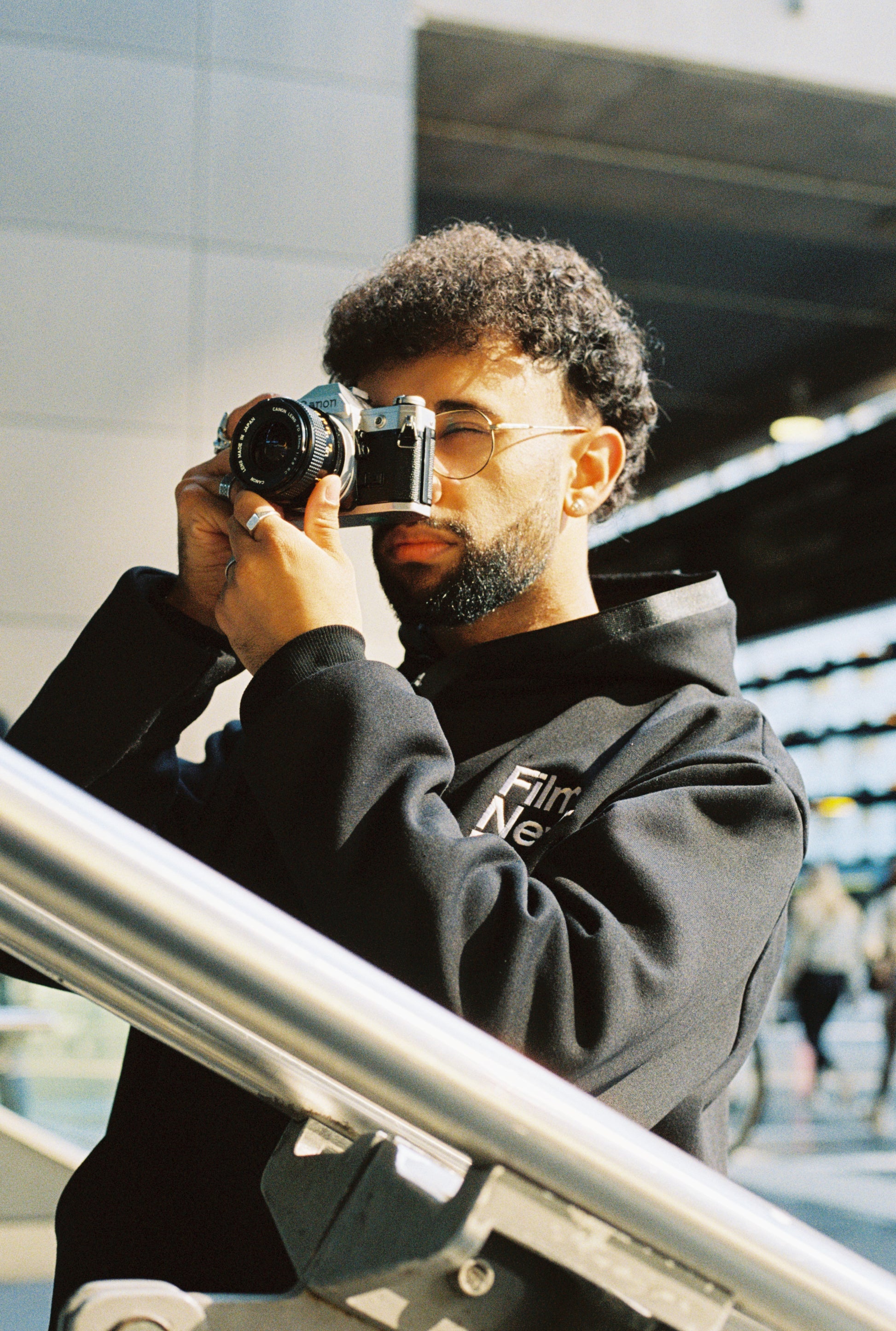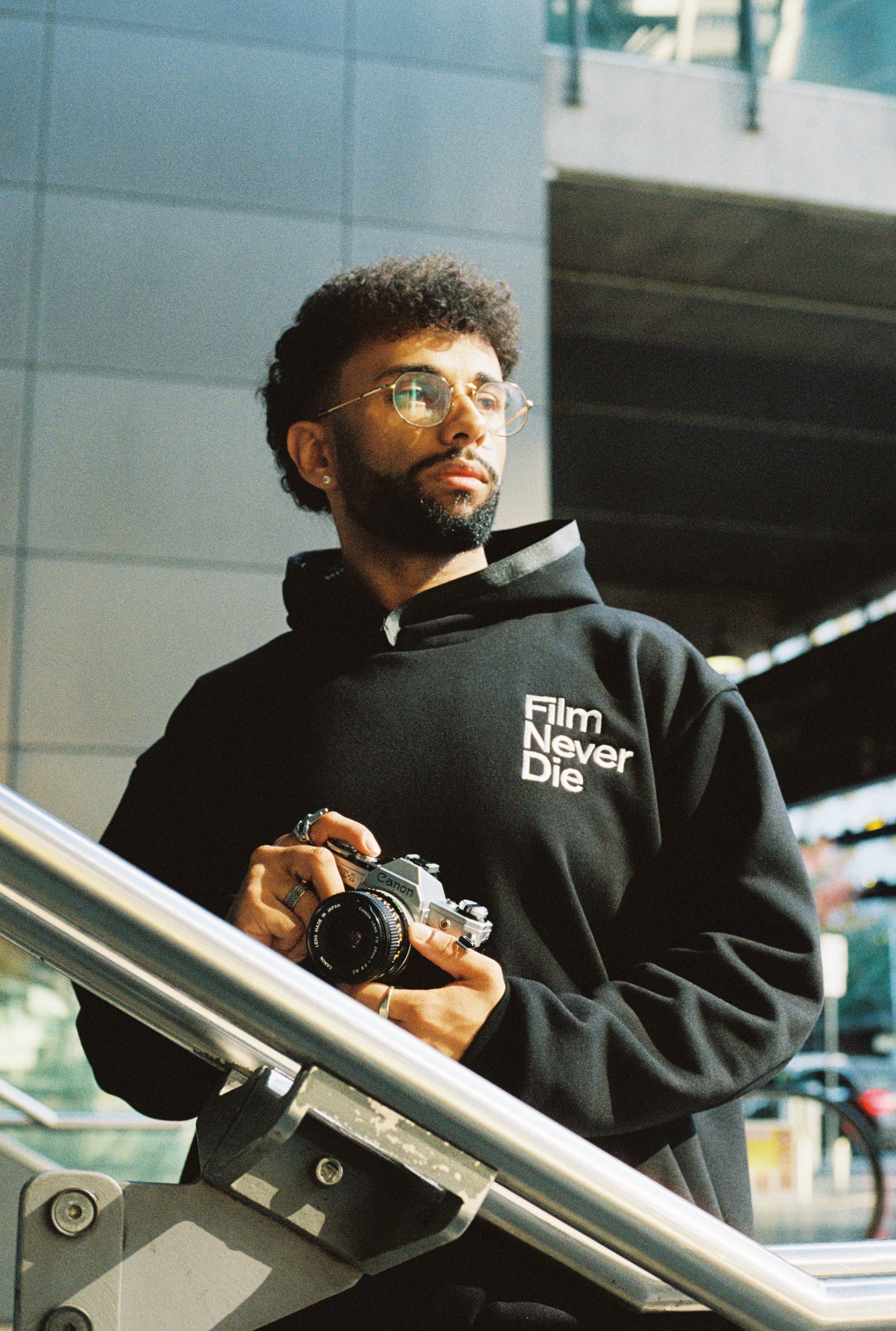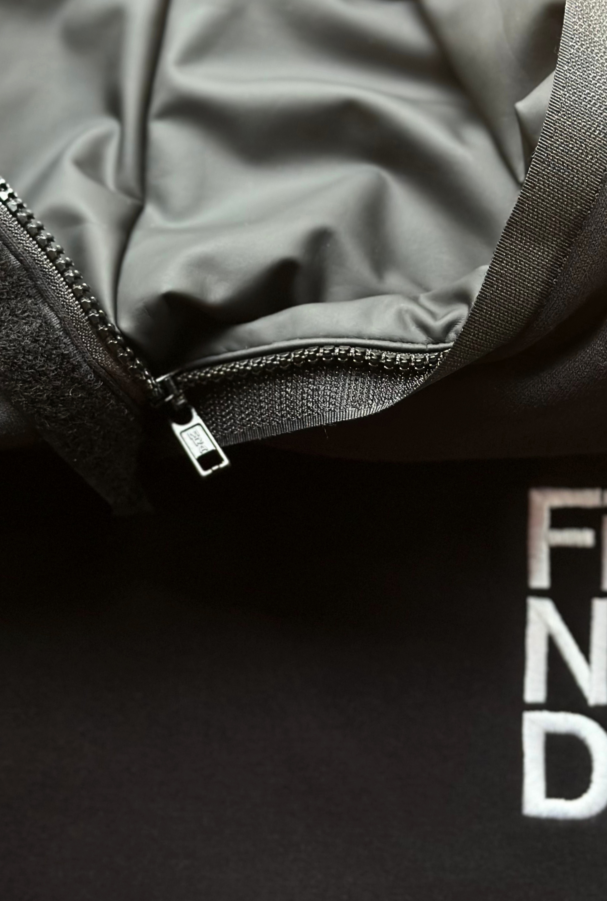 At the hood opening and at the base of the hoodie we have a thick zip and velcro, both added to block out as much light as possible. Other features include a premium FilmNeverDie embroidered logo and and front facing pockets.