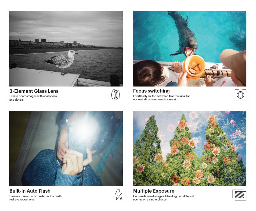 It also features 2-zone focus, allowing for a quick adjustment between landscape and close-up settings. The unique double exposure function also invites creative expression by blending two scenes into one captivating image.