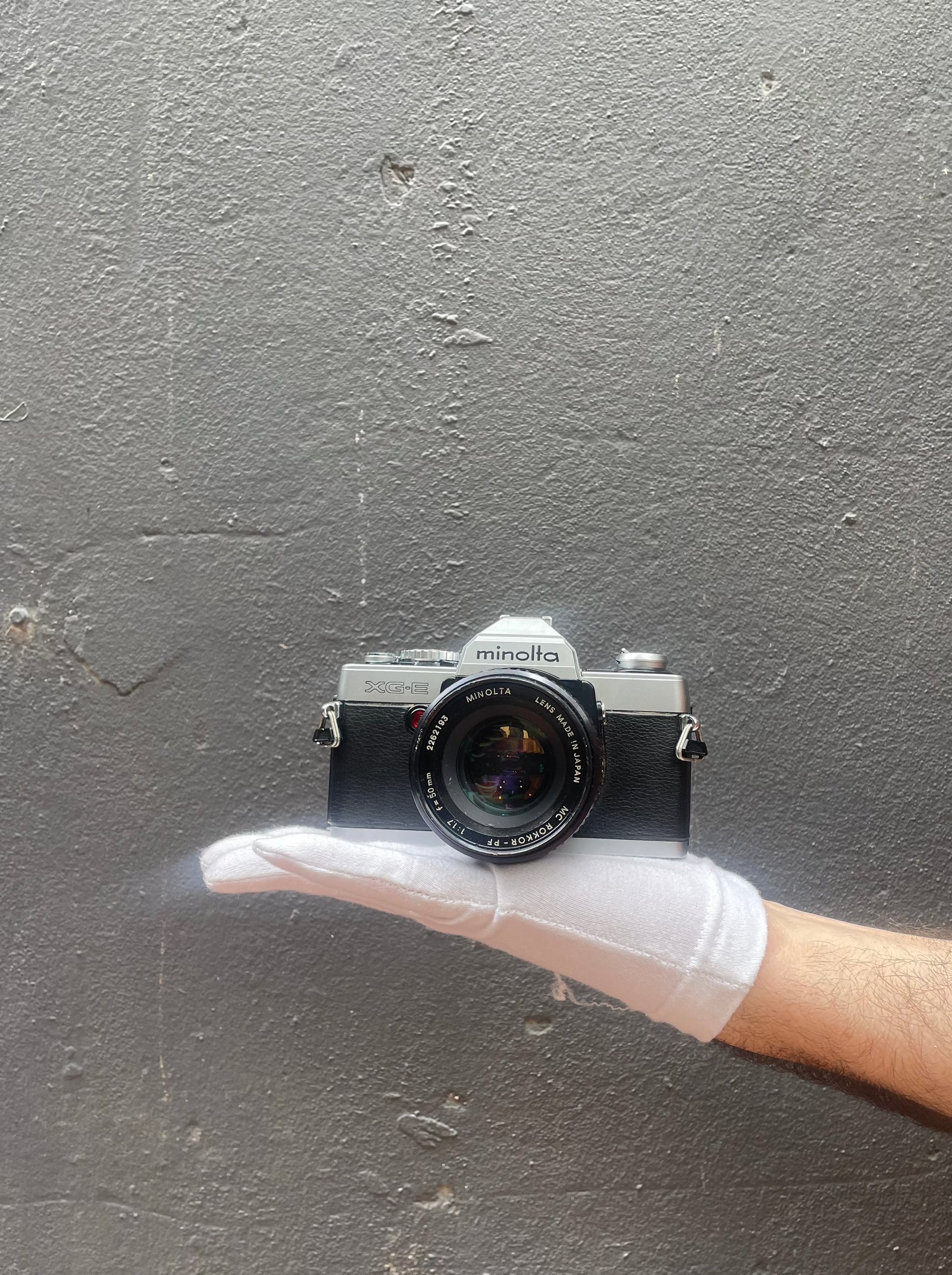 The Minolta XG-E is a rugged, compact yet stylish 35mm SLR camera. This camera is great for a beginner - it is easy to use with automatic metering modes available alongside manual metering modes. The camera is also lightweight, making it a great travel companion with its sharp 50mm f/1.8 lens.