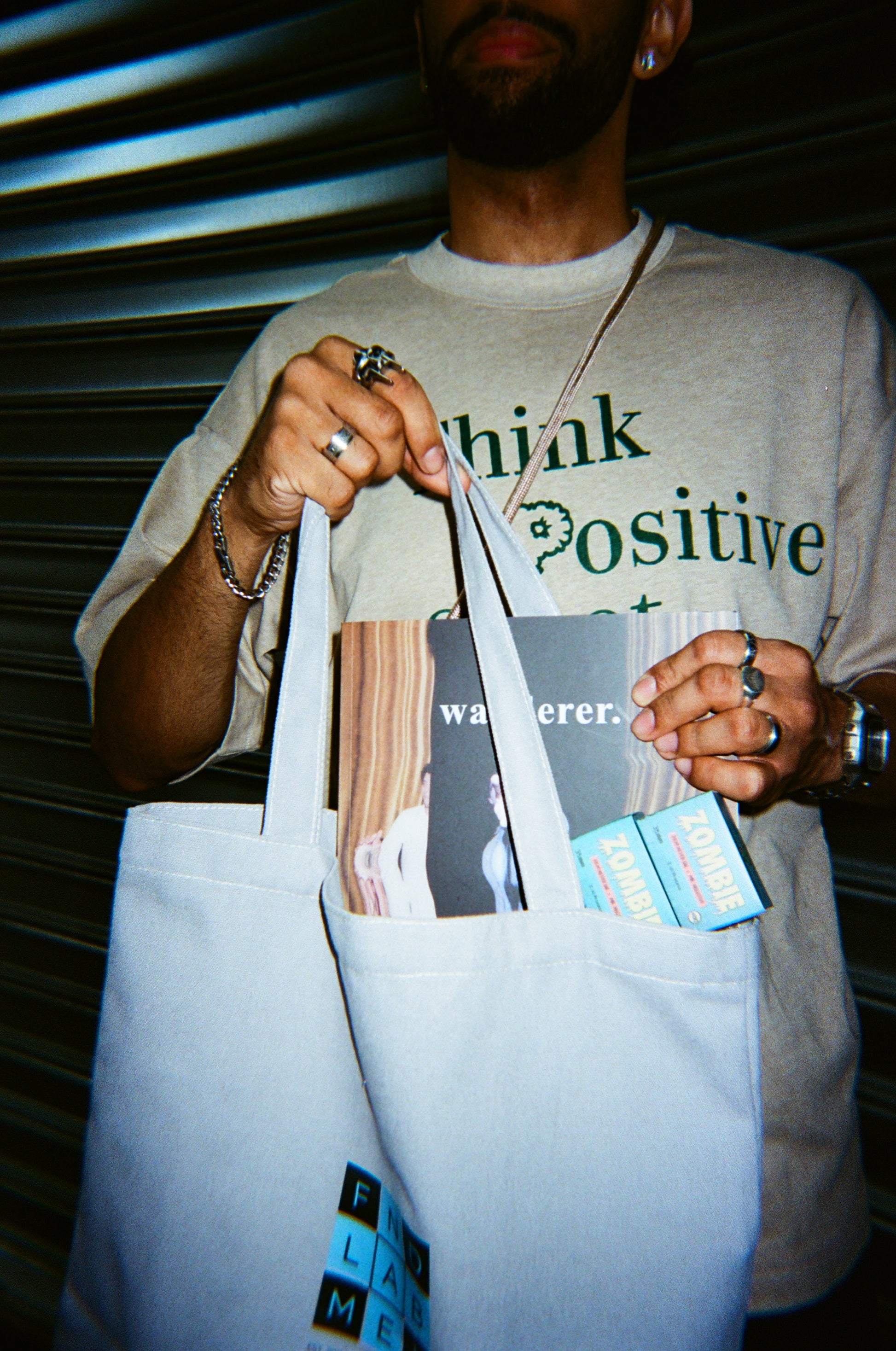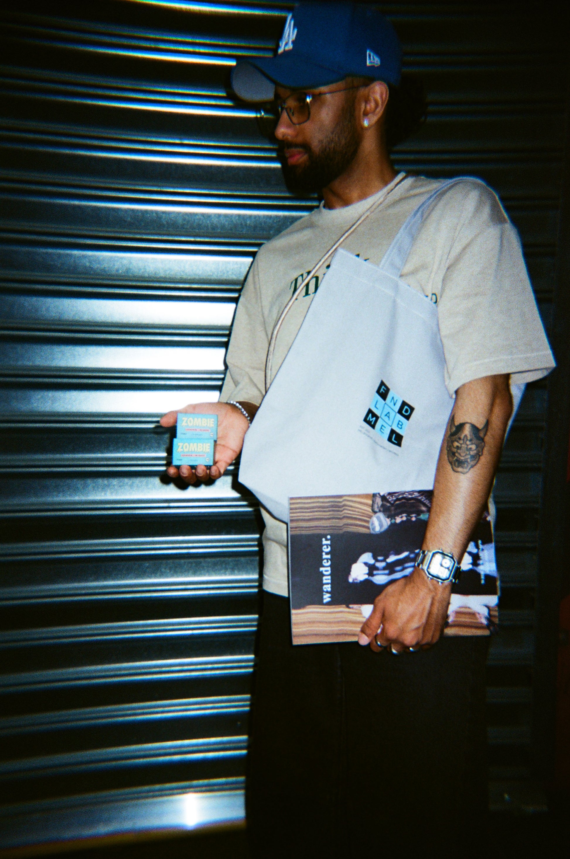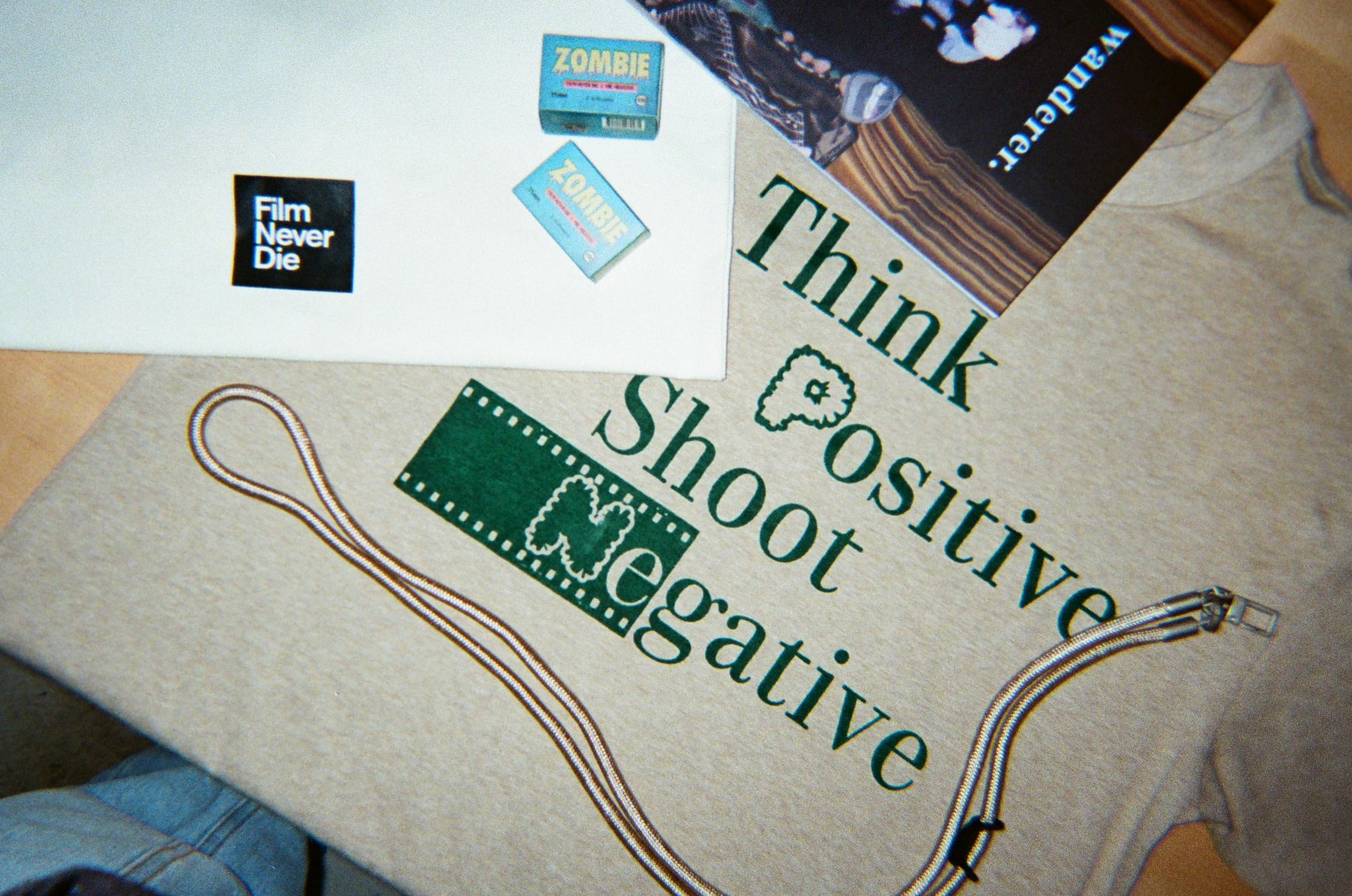 Everything else in the kit is what you'd want around you while you're shooting. The shoulder strap is champagne — not the obvious choice, which is exactly why it works. The tote holds everything. The beige tee is the one you reach for without thinking. And the Wanderer magazine is there for when you're looking for inspiration, or it could be a really cool addition to your coffee table.